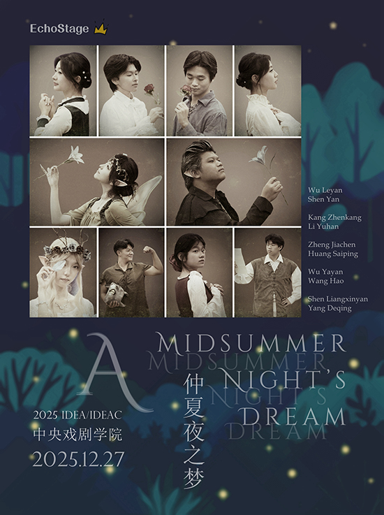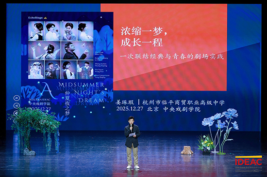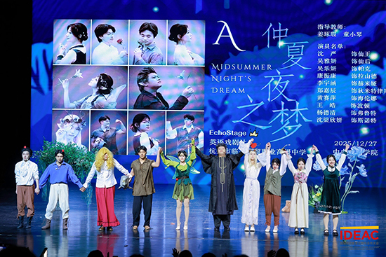 2025年12月25日至28日,浙江开放大学临平学院EchoStage英语戏剧社的十位学生演员在指导教师姜琢瑕、童小琴老师的带领下远赴北京,参加IDEAC青少年国际戏剧文化交流展暨第八届“蓝斗篷”青少年创意戏剧国际展评,在中央戏剧学院主剧场演绎了由团队改编的莎士比亚经典作品《仲夏夜之梦》。
