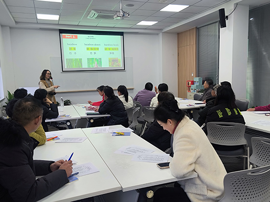 本次新课紧扣“共富”主题,聚焦“安吉好物”的英语表达。葛教授结合安吉白茶、竹制品、笋干等地方特色产品,通过“单词卡+实物展示”的方式,逐一教学“Anji White Tea”“bamboo products”“dried bamboo shoots”等核心词汇,并创新采用“中文读音标注”辅助记忆,降低学习门槛。针对村民关心的“好物购”场景,她重点讲解了“How much is it?”“How do you pay?”等实用句型,现场模拟买卖对话,让学员在互动中掌握沟通技巧。