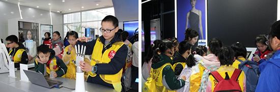在自由实践阶段,同学们按兴趣分组,灵活选择体验项目:最受欢迎的项目是体验《敦煌飞天梦华录》精华版,同学们带上VR眼镜穿越千年文明等等,这里集结了科技与时尚的创新产品,为旅程画上充满未来感的句号。