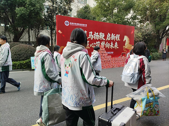 2026年3月4日,农历丙午马年正月十六,杭州市良渚职业高级中学校园内春意萌动、秩序井然。按照“错峰、有序、安全”的原则,全校学生分时段重返校园,开启新学期的学习生活。学校各部门通力协作,师生志愿服务、祝福盲盒发放助力润玉“积极教育+”等环节亮点纷呈,充分展现了新学期的新气象与新温度。