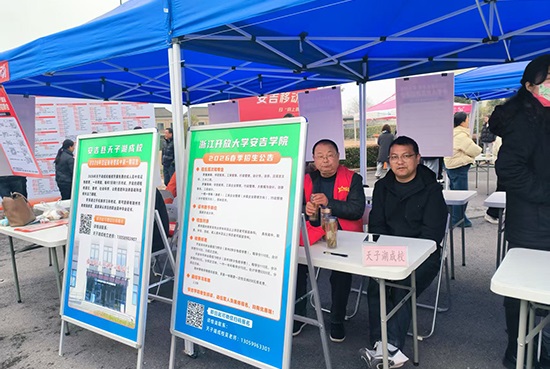 为深入贯彻落实稳就业、保民生决策部署,切实服务企业用工需求、助力群众高质量就业,2026年3月6日上午,由安吉县天子湖镇人民政府主办,安吉县社区教育学院天子湖分院等单位协办的2026年“春风行动”春季专场招聘会在天子湖镇政府广场圆满举行。学校主动担当、积极作为,将就业服务+技能培训+学历提升有机融合,为求职者与用人单位搭建精准对接桥梁。