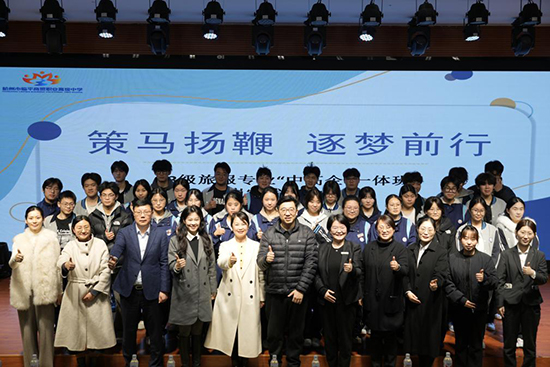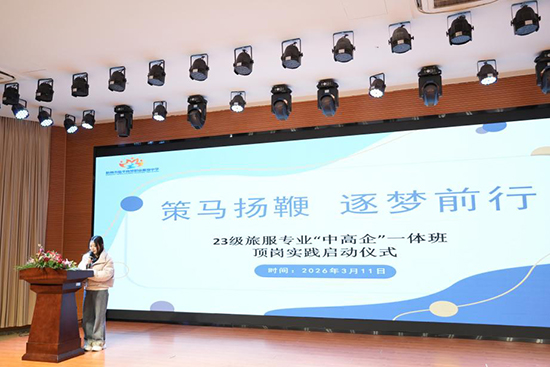 3月11日下午,学校在小剧场举行2025学年23级旅服专业中高企一体班社会实践启动仪式。杭州科技职业技术学院旅游学院副院长刘昀及酒店管理专业副主任刘庆苏,浙商名都开元酒店人事总监马骏俏,杭州市临平大酒店人力资源部经理毛罕嫣,杭州富邦丽佳国际大酒店人力资源部副总监朱建青及学校周黎霞副院长,就业实训处汪会文主任,品质服务与管理专业部王海珍部长出席此次活动。