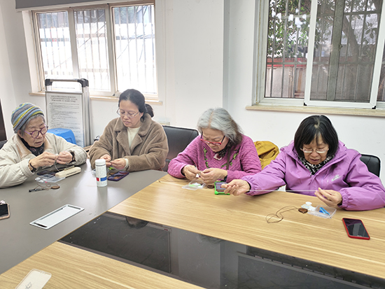 指尖翻飞间,一块块素雅精致的宋锦面料,经过裁剪、缝合、组装,渐渐变成了一件件兼具古典韵味与现代美感的毛衣链。大家纷纷将成品佩戴在颈间,互相欣赏、拍照留念,脸上洋溢着满满的成就感与喜悦。“第一次接触宋锦,不仅学会了做毛衣链,还了解了很多传统文化知识,太有意义了。”参与活动的夏阿姨笑着说道。