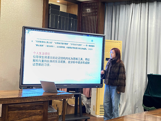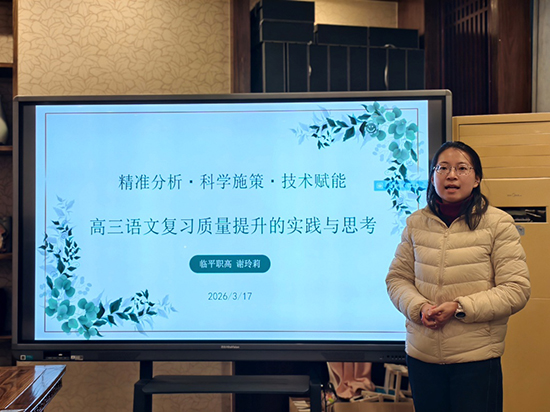 乔司职高徐威仪老师通过对比高二统测与近三年人人赛试题,指出两类考试均注重情境化与思辨性,主观题占比不断提高。她结合学情指出,学生在信息提取、论证逻辑、批判思维等方面存在短板,建议以专题教学、情境赋能、互文阅读为抓手,在复习中兼顾基础巩固与思维训练,将能力培养融入阅读与写作教学全过程。