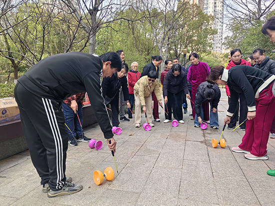 最具烟火气的当属非遗空竹班。君景庭小区商业街上,郭友海老师带领二十余位学员玩转空竹,抖、拉、抛、接间,彩色空竹在空中划出优美弧线。学员们相互切磋、互帮互助、其乐融融,欢声笑语伴着春日微风,回荡在小区的每个角落。