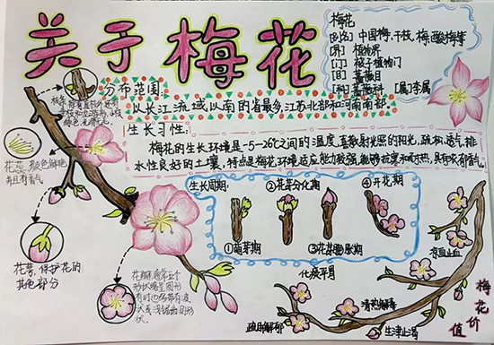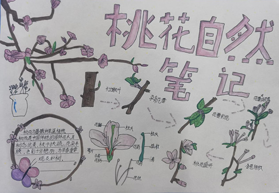 回到课堂,孩子们将户外观察的点滴收获,化作笔下鲜活生动的自然笔记。一幅幅作品充满童趣与巧思:有细致刻画猫咪五官与习性的创意笔记,有完整呈现蝴蝶生命周期的科普笔记,有记录桃花生长全过程的精美手绘,还有细节满满的动物观察、梅花生长功用解读、银杏叶果全方位解析等作品,一张张手抄报定格了本次实践活动的丰硕成果。
