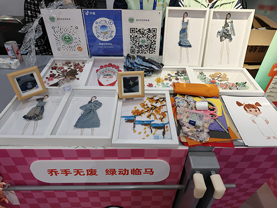 室内展位,绿艺社成员夏悦、董馨于、秦佳筠、俞依雯与指导教师潘露琪、姚赛花精心布置了充满绿色艺术气息的展区,从旧牛仔裤改造的创意手工装饰画到专业废弃纸张制作的衍纸画,每一件作品都展现着“巧手变废为宝”的成果。同学们化身“小老师”,带领市民们体验旧衣拼贴手工。剪刀起落间,原本要被丢弃的布料碎片,在大家的创意下变成了独一无二的艺术作品,让环保不再是抽象的口号,而是触手可及的实践。