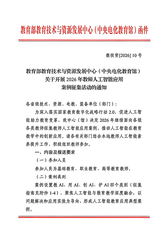 教育部教育技术与资源发展中心(中央电化教育馆) 关于开展2026年教师人工智能应用 案例征集活动的通知
