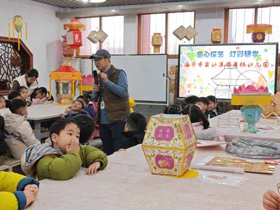 在“引进来”的同时,海职高更注重“走出去”。作为肩负传承使命的灯彩非遗传承人,海职高寿斌杰老师积极响应非遗进校园的号召,将硖石灯彩的课堂延伸至幼儿园。