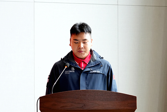 云南交通运输职业学院选手诸童代表全体选手登台发言。他表示,在接下来的集训中,坚决服从专家组和教练组的统一安排,专心投入训练,精益求精,不断打磨技能、突破自我,力争在第 48届世界技能大赛中奋勇拼搏、争创佳绩,展现新时代技能人才的风采,为国家争光、为梦想添彩。