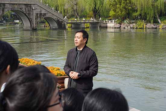 抵达南湖会景园内的望湖广场,严叶伟现场讲授一堂“微思政课”。他从嘉兴独有的“两个文化”切入,将革命文化的红船精神与历史文化的江南文脉相融合,勉励学生:“你们脚下的这片土地,既孕育了开天辟地的革命火种,也积淀了千年的诗书风雅。传承好‘两个文化’,是当代青年的责任。”同学们凝神聆听,并不时在学习单上记录。这堂在湖畔开讲的思政课,没有了围墙的阻隔,却多了几分直抵人心的力量。
