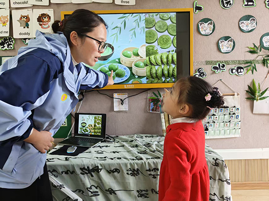 舞姿传递春日情。大班幼儿伴着轻柔音乐开展清明主题律动,抬手似柳枝轻摇,踏步如踏青寻春,小小身影跟着节奏欢快舞动。孩子们一边念诵儿歌,一边舒展动作,在轻松氛围里感受清明的生机与诗意,用童真方式迎接春天。