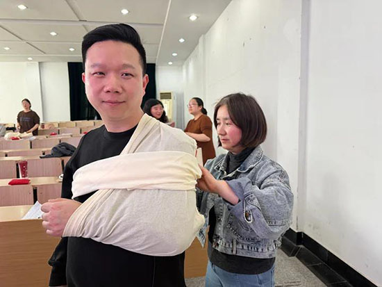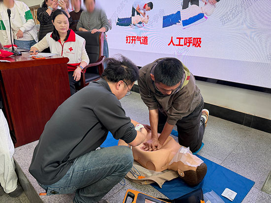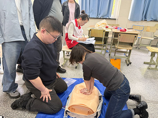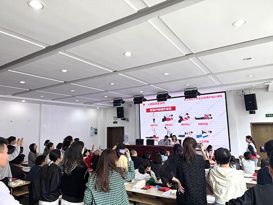 实操演练环节,讲师现场搭建起模拟急救场景,亲自示范了心肺复苏的精准按压位置、适宜深度与合理频率,AED的迅速开机、正确贴片与安全除颤流程,海姆立克急救法的标准操作动作,以及加压包扎、骨折固定等使用内容。教师们分组进行练习,在讲师的悉心指导下,反复演练各项急救技能,不放过任何一个细节。
