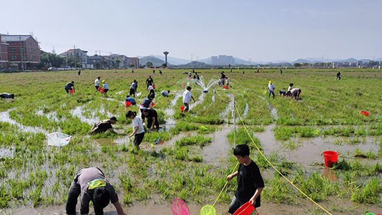 活动启动后,身着红马甲的“五老”志愿者在枫桥镇关工委业务副主任胡国生的带领下,迅速前往田埂路边、通道出入口等关键点位值守。志愿者们耐心引导孩子们有序参与下田“柯鱼”体验,反复提醒大家注意脚下安全,严防推搡拥挤、滑倒磕碰等意外情况发生。面对现场热闹紧张的氛围,“五老”志愿者们一丝不苟、全程值守,目光紧随孩子们的身影,密切关注活动现场动态。同时,他们积极协助组委会清点参与人数,实时掌握孩子们的活动情况,确保每位参与者都在安全看护范围之内。