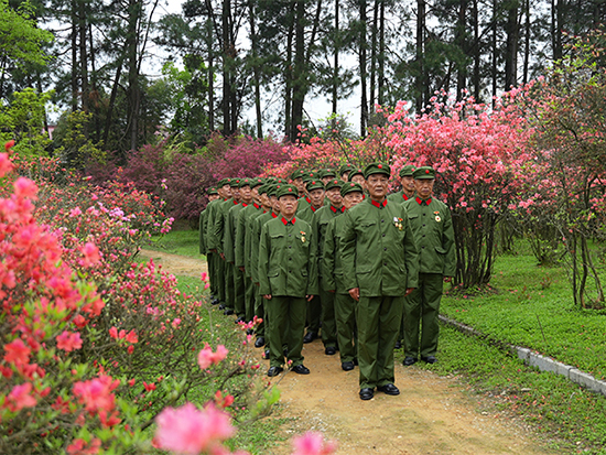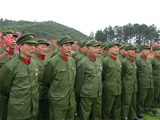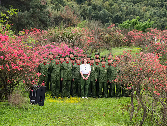 身着军装的老兵们精神饱满、神情庄重,带着对革命岁月的追忆和对祖国的热爱,认真跟唱、反复练习。虽然部分老兵年纪偏大、嗓音条件有限,但大家始终保持着昂扬的精神状态,用洪亮的歌声演绎着《映山红》的深情与力量,歌声回荡在映山红基地,诉说着老兵们不变的初心与担当。