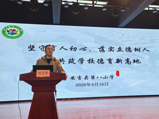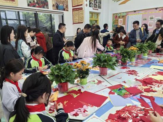 在安吉第八小学,学校书记彭洪星带领大家参观了极具特色的剪纸课程成果展示,一张张精美的剪纸作品展现了学校“以美育人、以文化人”的生动实践。在随后的分享中,彭书记从学校德育工作的困惑与思考出发,系统介绍了学校在德育实践与探索方面的创新举措,为学员们提供了宝贵的借鉴经验。