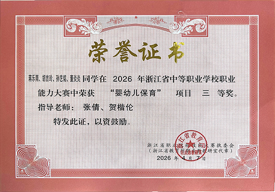 康养护理系:蒋乐雨、胡吉玲、孙艺铭、董炎炎四位同学在婴幼儿保育赛项中荣获省三等奖。指导老师:贺楷伦、张倩;班主任:林红。