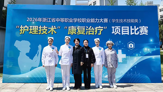康养护理系:张馨彤、陈姿米、俞思伊、施婷婷四位同学在护理技术赛项中荣获省三等奖。指导老师:胡舟霞、郑舟军;班主任:章丹丹、郭怡。