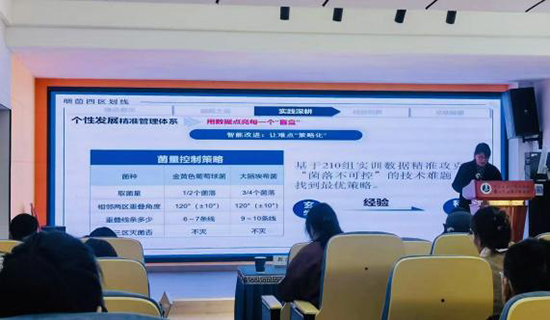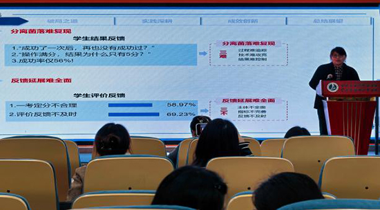 海宁卫生学校杜泺漪老师带来《三阶递进·数据赋能:微生物检验实训教学改革的创新实践》分享。针对传统实训教学中“分离菌落难复现”“反馈延时不全面”“技术难点突出”等痛点,她基于认知建构理论与数据驱动范式,构建了“虚拟—仿真—实战”三阶递进实训体系:初阶通过绘图软件进行虚拟划线练习,实现零成本反复训练;中阶借助无标本仿真运笔系统配合示教投屏纠错,帮助学生形成肌肉记忆;高阶对接医院检验科真实标本开展标准化实战考核。在评价体系方面,她引入“技术力—认知力—发展力”三维矩阵,结合动态雷达图实现学生能力的可视化评估。杜老师表示,未来将进一步探索人工智能在实训教学中的应用,推动微生物检验教学迈向智能化、零成本、高复用的新阶段。