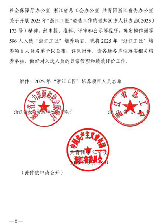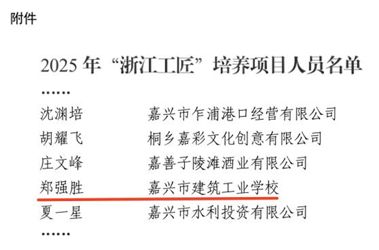 近日,省人力资源和社会保障厅联合省总工会、团省委公布了2025年“浙江工匠”入选名单。嘉兴市建筑工业学校专业教师郑强胜光荣上榜!这位扎根嘉兴建校二十五年的党员教师,用坚守与创新书写了一名职教人的“工匠答卷”!
