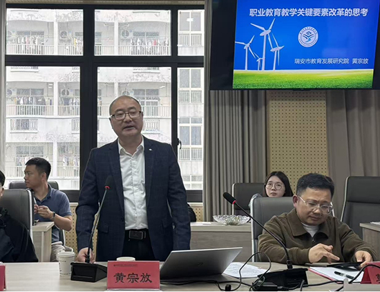瑞安市教育发展研究院黄宗放老师作《中职教学关键要素改革的思考》专题报告。黄老师紧扣职业教育最新政策导向,围绕专业设置、课程体系、教材建设、师资培养、实训基地五大核心要素,深入解读中职教学改革内涵与要求,强调教学改革要立足学生发展、对接产业需求、深化产教融合,为一线教师推进课堂变革、提升育人质量指明方向、提供遵循。