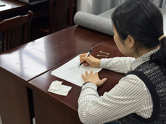 在掌握了基本线条技法后,课程进入趣味实践环节——绘制蝴蝶结。老师将蝴蝶结的结构分解为流畅的曲线与巧妙的穿插关系,指导学员如何运用刚刚练就的排线技巧,表现出蝴蝶结丝带的转折与光影。学员们聚精会神,手中的圆珠笔不再是单纯的书写工具,转而成为创造美的画笔。当一个个或简约或繁复、线条流畅的蝴蝶结跃然纸上时,课堂里充满了成就感与欢声笑语。
