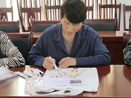 活动中,郑老师系统梳理渔民画的历史渊源与美学特征,从色彩搭配、构图特点到线条运用进行细致讲解与示范,着重阐释其以鲜明色彩、生动笔触展现海岛风土与渔家生活的艺术特质。学员们认真聆听、详实记录,随后进入创作环节。海浪翻涌、渔船归港、灯塔伫立、鱼鲞晾晒——村民们以画笔为媒,将渔家意象逐一呈现于帆布袋之上,尽显乡土创意与手工巧思。