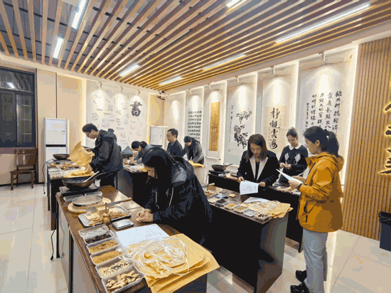 桌面上整齐摆放着三十种常见中草药标本,学员们需在规定时间内写出每味药材的名称及主要功效。从狗脊、赤小豆到冬瓜皮、玉米须,大家提笔疾书,自信从容。“这个考的是真功夫,光靠死记硬背不行,必须平时多看、多闻、多摸。”学员小李坦言,培训期间他每天对着药材标本反复辨认,还拍了照片回家复习,“今天全部认出来了,很有成就感。”考评员们认真核对着每一份答卷,频频点头。