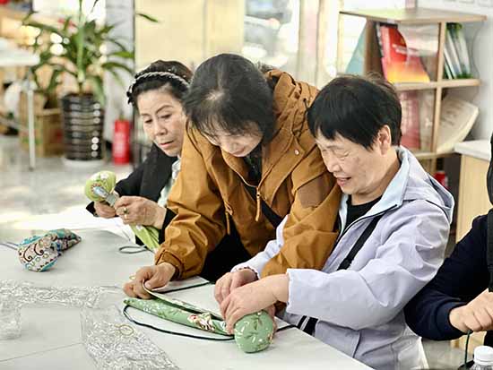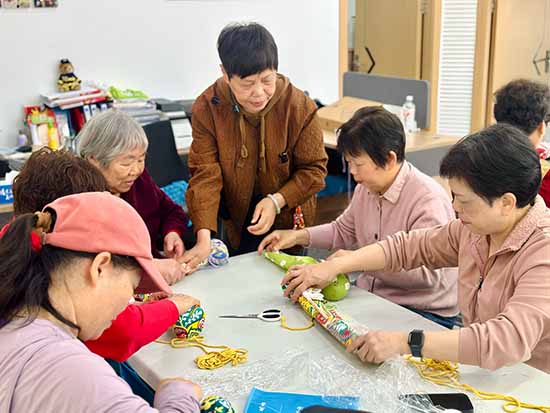 理论知识的普及之外,社区还组织了“艾草锤”制作体验活动。艾草锤是传统中医外治法的一种载体,通过轻轻捶打肩颈、腰背等部位,能起到温通经络、缓解疲劳的作用。工作人员提前准备了艾草、棉布、锤柄等材料,指导居民填艾、定型、捆扎。不一会儿,一个个带着淡淡艾香的养生艾草锤就制作完成,居民们拿着自己亲手做的艾草锤互相敲打肩颈腰背,现场气氛轻松热闹。