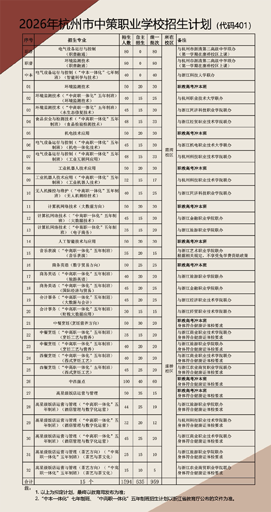 学校专业丰富,特色鲜明。2026年,学校计划招收新生1594名,其中自主招生635名,集中统一招生959名(含“中本一体化”七年制招生40名,职普融通试点班招生160人)。