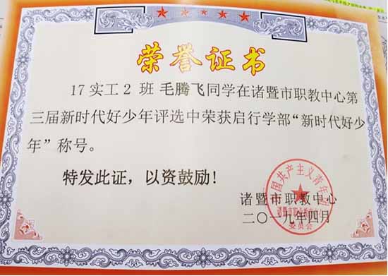 2017年,毛腾飞进入诸暨市职教中心17实工2班。他外向开朗,会抓住每一个锻炼机会:演讲、摄影、主持、志愿服务……他拿下了“十佳好少年”、绍兴市职业能力大赛三等奖等多项荣誉。