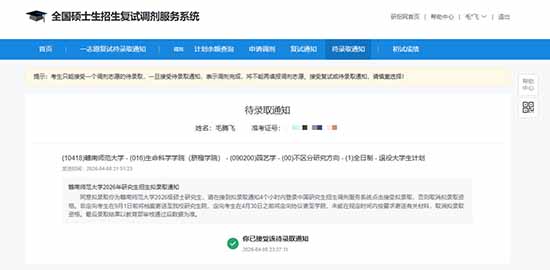 考研出分,英语差1分遗憾无缘第一志愿,总分超国家线40分。他调整心态,先通过免试专升本被温州理工学院录取,又全力调剂。4月8日凌晨,调剂系统开放。他填报两所院校三个专业,中午收到复试通知,两场面试都在当天下午。他放弃了广东海洋大学,全力冲刺赣南师范大学两个专业。从下午到晚上7点,接连完成两场面试+三门加试。晚上10点,电话响起:“同学,你被我们第一个专业录取了!”11点多,第二个专业的拟录取通知也来了。从诸暨职教中心,到军营,到赣南师大——他的求学路,走得滚烫而坚定。